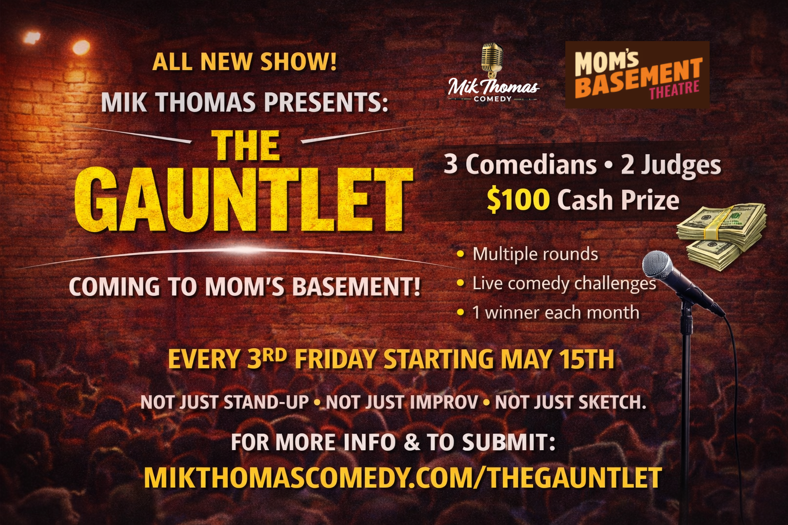 Mik Thomas Presents: The Gauntlet (at Mom’s Basement Theatre in Las Vegas) is a monthly live comedy competition where performers are pushed beyond a standard set and challenged to deliver in multiple formats in front of a live audience and judges.